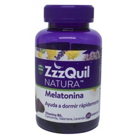 ZzzQuil Natura Melatonina es un suplemento que aprovecha las ventajas de la melatonina, de la vitamina B6 y de extractos florales, recomendado para el logro de un descanso tranquilo y relajado. Está libre de ingredientes que puedan crear adicción o inestabilidad emocional a largo plazo. Contiene una combinación especial de manzanilla, lavanda y valeriana. Junto con la melatonina, hormona que propicia el ciclo natural del sueño, interviene en el ritmo circadiano, acortando el tiempo que se requiere para quedarse dormido. El resultado es un mejor descanso nocturno. Puede ayudar a gozar de un sueño profundo de al menos 6 horas, que es el periodo mínimo que necesita el cuerpo y la mente para descansar totalmente y a diario. Este suplemento para dormir está recomendado para personas que sufran trastornos ocasionales de sueño. Es ideal para mujeres y hombres que presenten despertares nocturnos, insomnio o dormir intranquilo.
